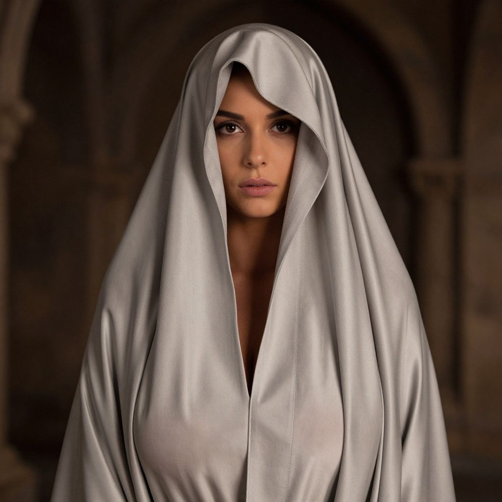 A high-resolution portrait of a woman standing in a dimly lit medieval-style hall, wearing a heavy, flowing silk veil with overlapping layers that hide her identity — the veil is partially draped over her shoulders and face, one layer drawn tightly over her eyes, another hanging loosely behind her; her face is slightly visible through the folds, with deep brown eyes and a thoughtful expression, emphasizing the theme of concealment and anonymity.. The woman has big tits and cute face