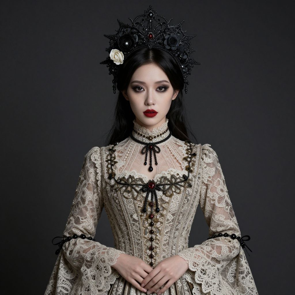 Photograph of a pale-skinned woman with long, straight black hair and striking red lipstick, wearing an elaborate Gothic-style, beige and black lace gown with intricate patterns. Her dress has sheer lace sleeves and a high, black ribbon-choked neckline. She has a black, ornate headpiece adorned with a white rose on her right side. Her hands are delicately clasped in front of her. The dark, solid background contrasts with her elaborate attire, highlighting her gothic elegance. The overall style is reminiscent of Victorian mourning fashion with a modern, gothic twist.