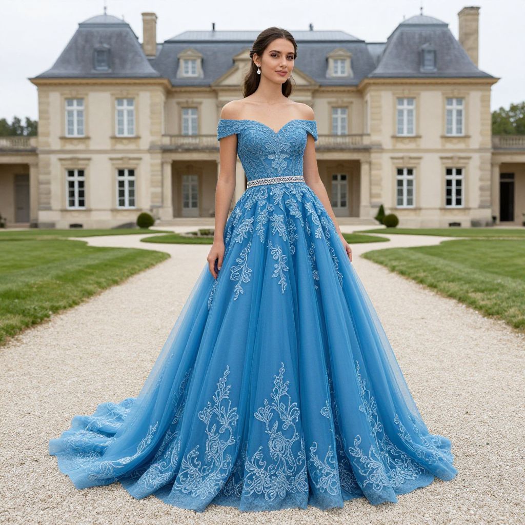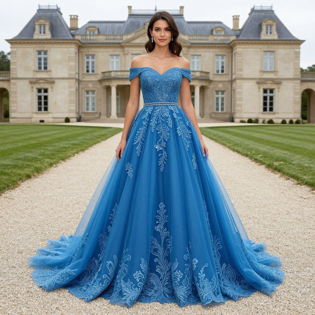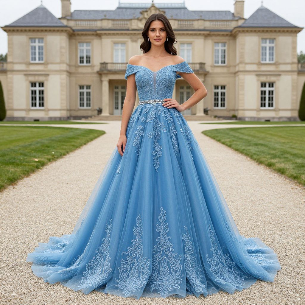 Elegant woman standing gracefully in front of a grand mansion, wearing a stunning off-the-shoulder blue tulle lace long prom dress adorned with intricate floral embroidery and a sparkling waistband, complemented by a voluminous skirt that flows elegantly across the gravel pathway.