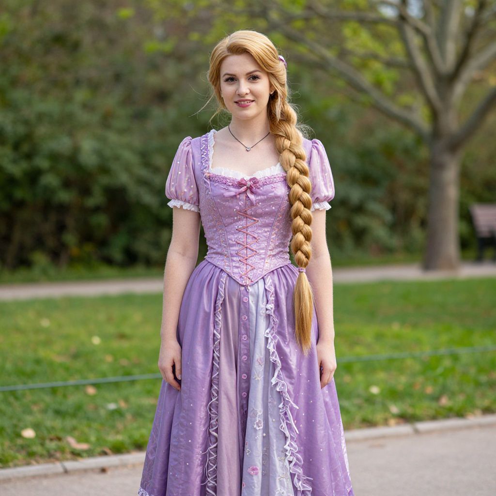 Purple Corset Dress Rapunzel, a woman in a purple dress standing in a park