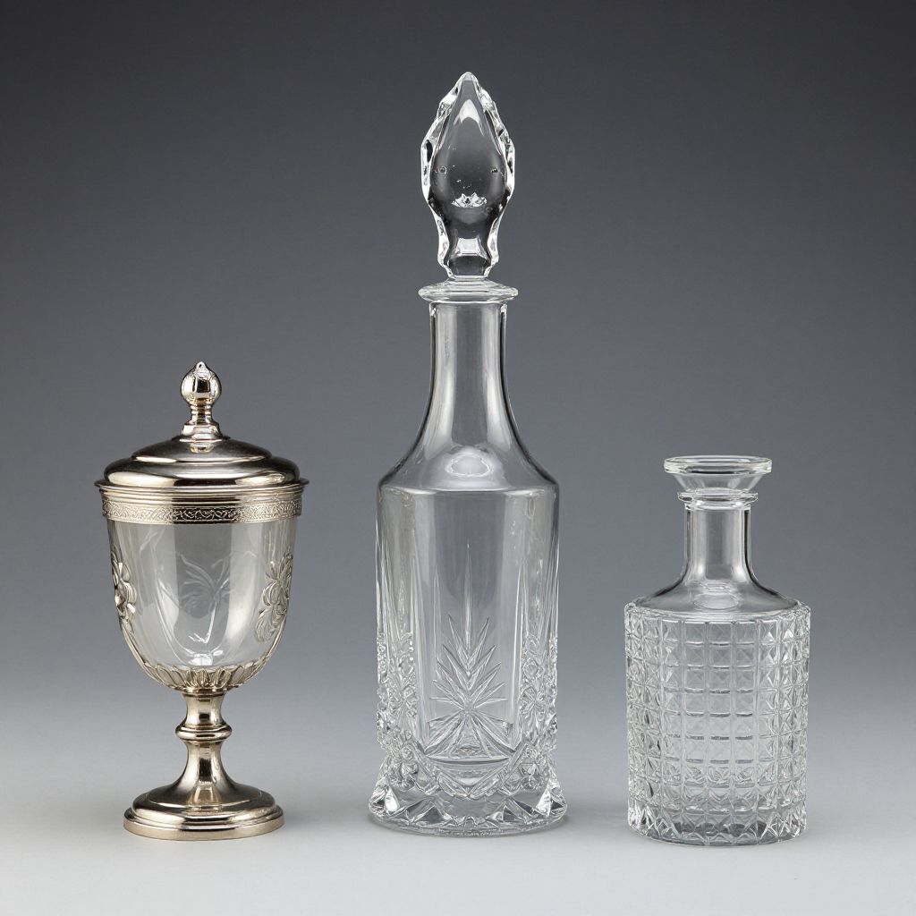 Arrangement of three elegant glassware pieces featuring a tall, intricately etched crystal decanter flanked by a polished silver-topped glass container on the left and a smaller, lattice-patterned bottle on the right, all displayed against a neutral background.