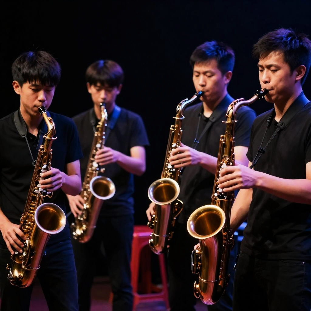 Photograph of four male musicians on stage. Three playing saxophones and one with an electric guitar. Dark clothing, intense focus, dim lighting. Background musician sits on red stool, slightly blurred. Musicians in the foreground are in sharp focus.