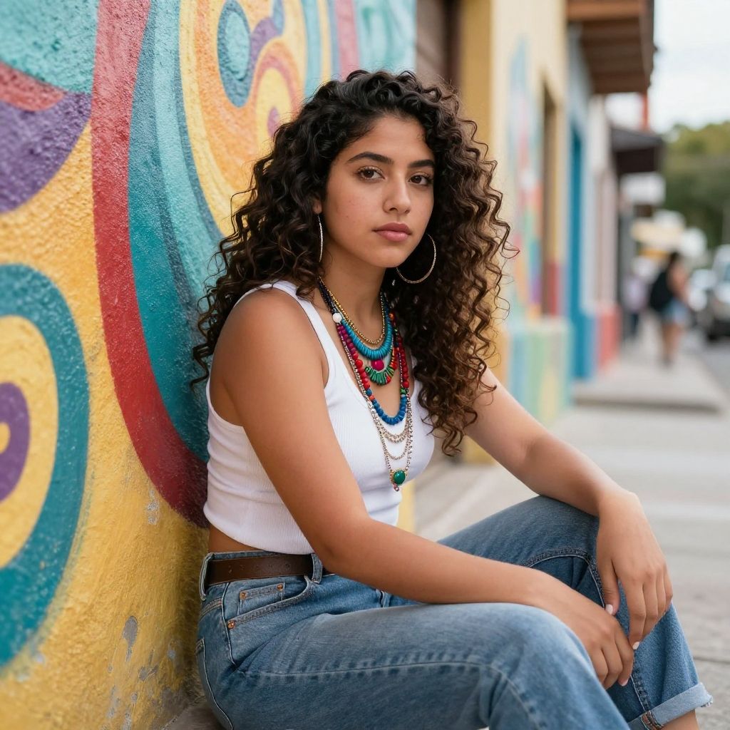 Mexican girl curly hair, sitting by colorful street murals, sunlit afternoon, casual modern outfit mixed with indigenous jewelry, expressive eyes, lively urban background