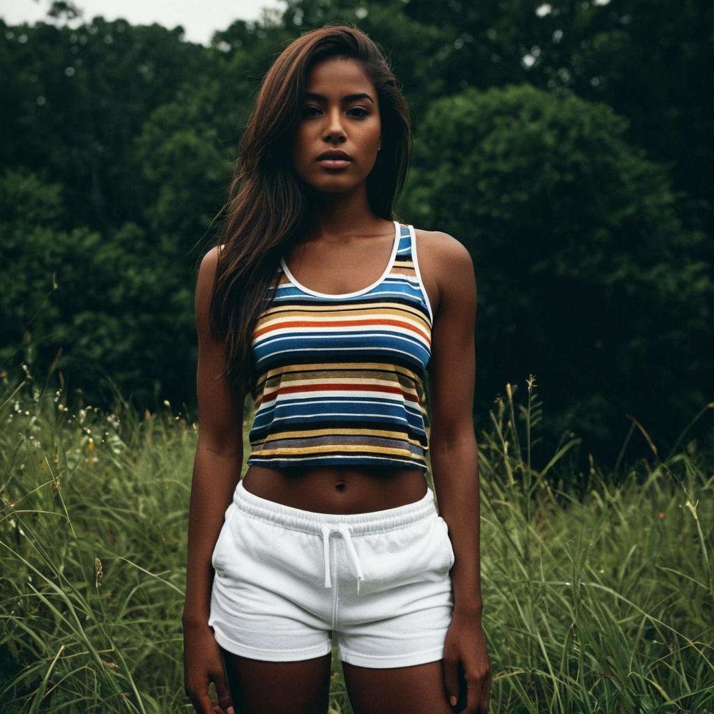 White shorts woman,1girl, solo, realistic, shorts, brown hair, long hair, tank top, lips, outdoors, dark-skinned female, photorealistic, dark skin, short shorts, multicolored clothes