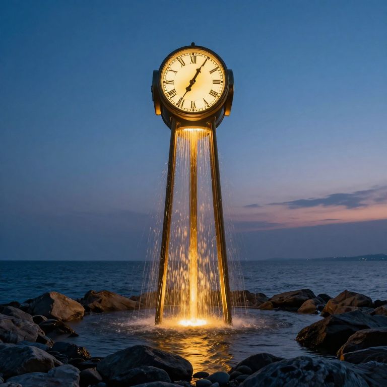 Golden rivulets cascade from a towering clock, its illuminated face glowing against the twilight sky as they spill onto the rocky shore, reflecting a surreal interplay of light and time.