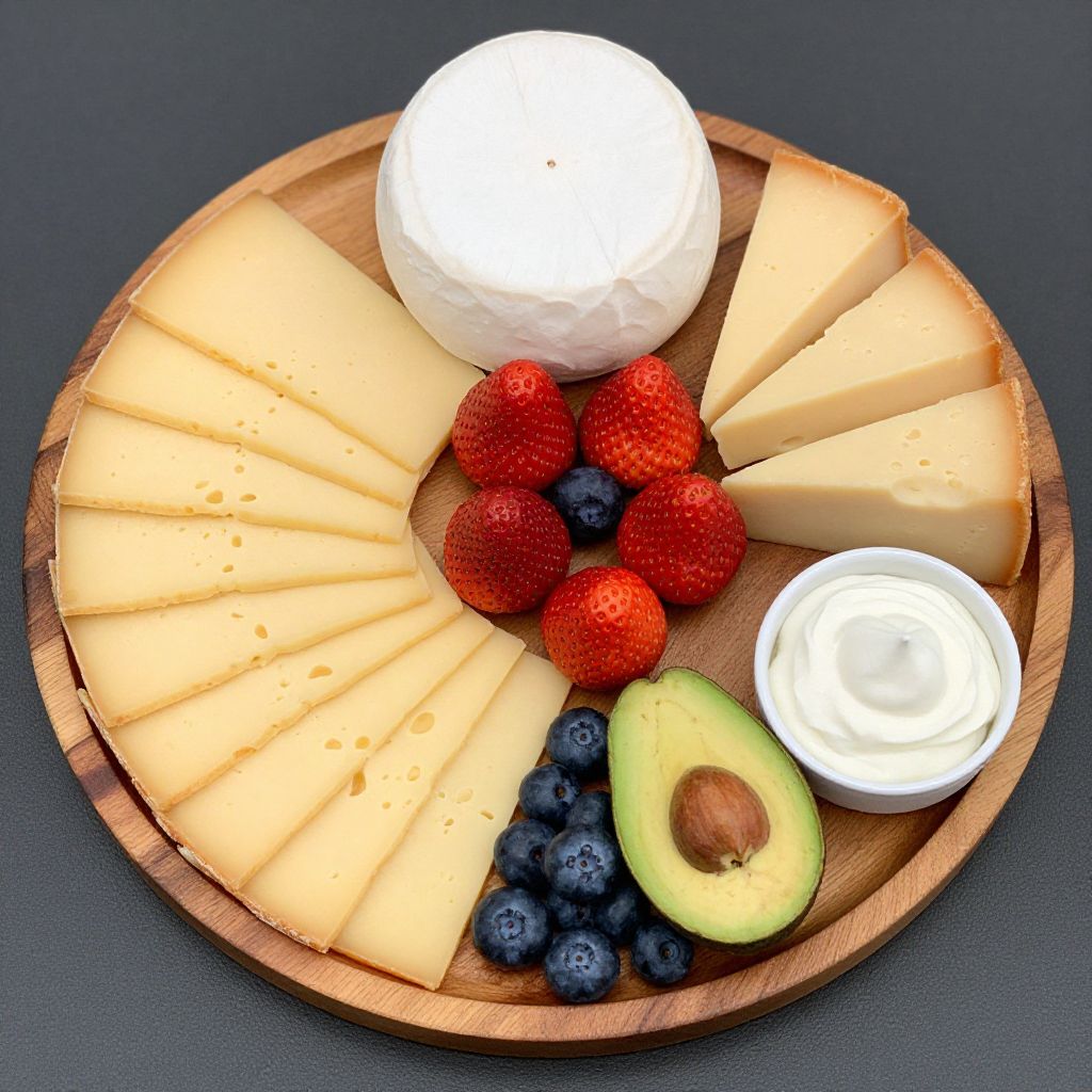 Cheese board featuring a round wooden platter adorned with neatly sliced yellow cheese, a whole creamy cheese dome, three triangular slices of cake, six vibrant strawberries, a halved avocado, a cluster of dark blueberries, and a small bowl of whipped cream, all artfully arranged for an elegant presentation.