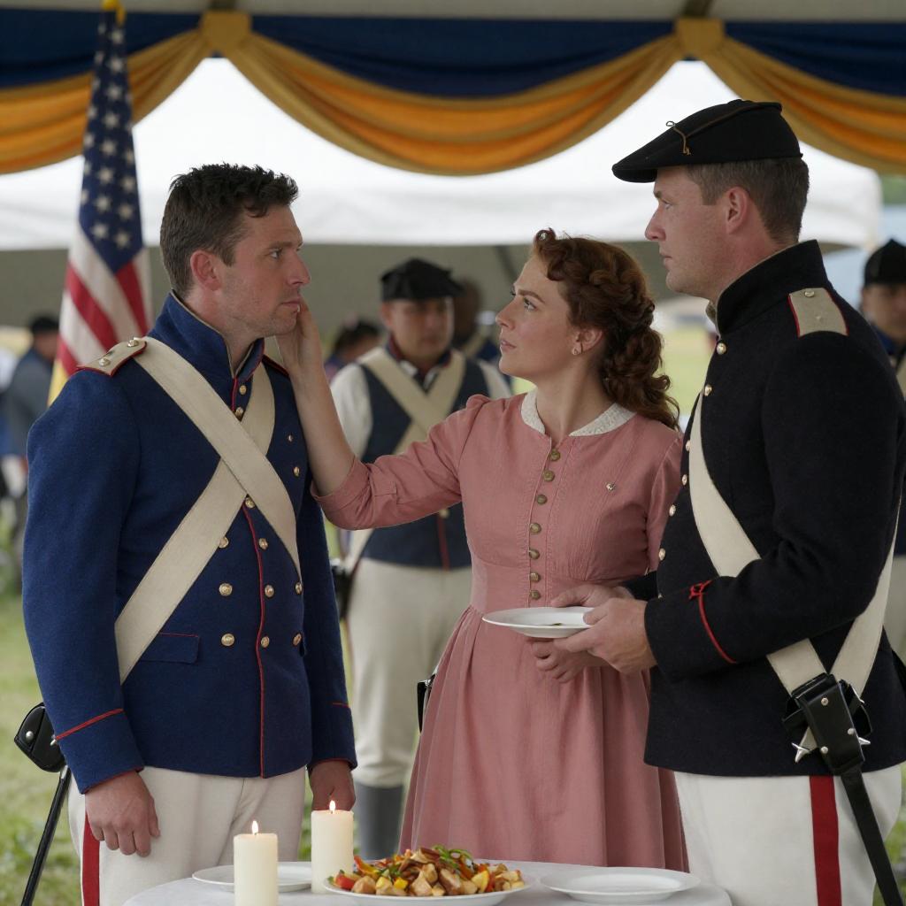 Photograph of a Civil War reenactment. Three people in the foreground: a man in a blue military uniform, a woman in a pink dress, and another man in a dark uniform. Woman touches man's cheek, other man holds a plate. Table with food, candles. Background with more people, American flag, blue and yellow drapery. Intense expressions on faces.