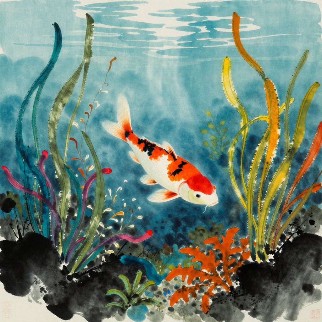 Create an image of an underwater paradise radiating serene calmness, featuring vibrant aquatic plants emanating captivating colors reminiscent of traditional Japanese ink painting methods. Within this fantastical seascape, an abstract waterscape unfurls as a koi fish elegantly swims through a harmonious fusion of reality and imagination. This distinctive visual tapestry goes beyond typical underwater scenes by incorporating elements that evoke both peace and intrigue, enticing the viewer into a realm where time and space are re-envisioned in an enthralling, immersive journey.