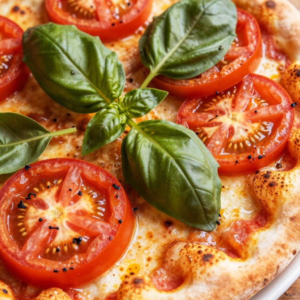 Close-up photograph of a fresh tomato and basil pizza, with vibrant red tomato slices, green basil leaves, and melted cheese.