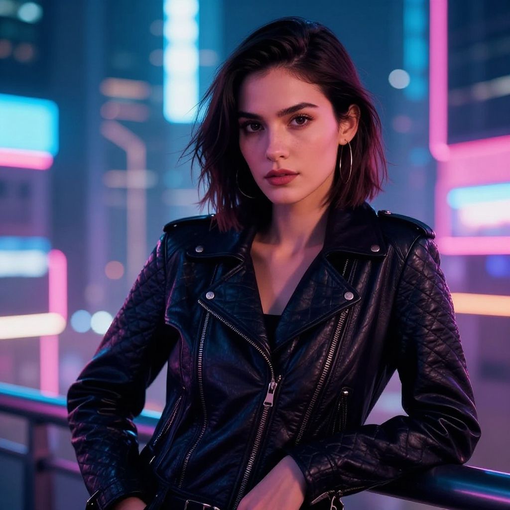 ((masterpiece)) ((best quality)), photorealistic, detailed character, detailed face, vibrant colors, saturated colors, profesional photo, slim body, slender figure, she wears Quilted faux leather jacket, Affection face expression, Leaning on a railing in A futuristic cityscape with neon lights close up chracter focus
