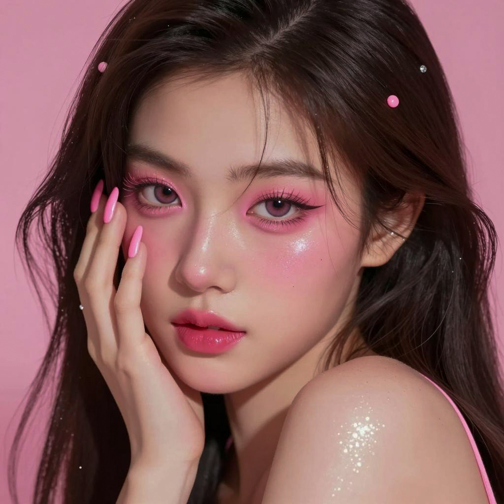 Asian woman with pink eye makeup, glitter on cheeks and hand, pink nail polish, dark hair with small pink and silver accessories, pink background. Hand near face, glitter on shoulders. Intense gaze. Digital illustration style. Pink lips. Glitter on hand and cheeks. Pink nail polish. Pink and silver accents.