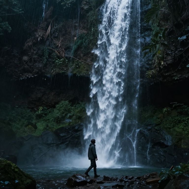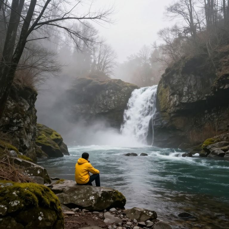 Mist gently billows above a serene river, cascading downhill between moss-covered cliffs as a solitary figure in a yellow jacket sits contemplatively on the rocky shore, surrounded by bare trees and the hazy embrace of morning fog.