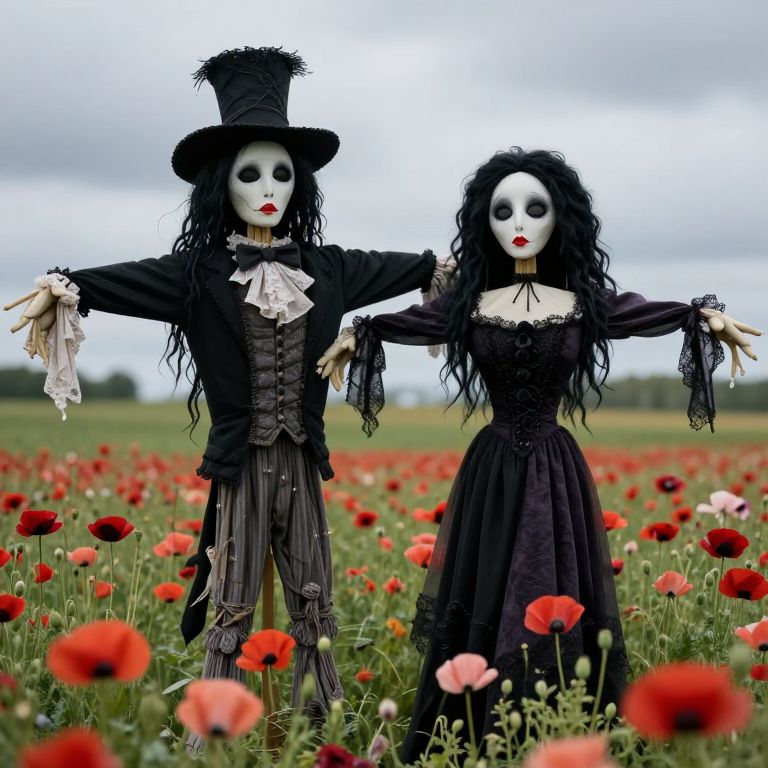 Two eerie, Victorian-style scarecrows with long black hair and red lips stand in a field of poppy flowers, evoking a Tim Burton-like atmosphere.