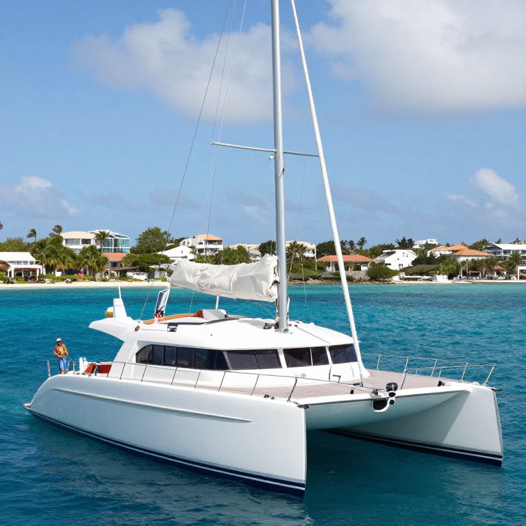 Photograph of a sleek, white sailboat with a tall mast, anchored in clear turquoise water, against a backdrop of white houses and palm trees under