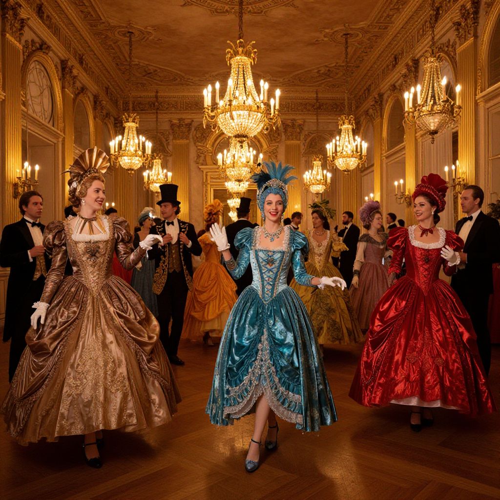 Photograph of an opulent ballroom scene featuring a lively group of people dressed in elaborate 18th-century French aristocratic attire. Central female figure in a shimmering blue velvet gown with puffed sleeves, white gloves, and a blue feathered headpiece, energetically dances. Surrounding her are men in black suits with top hats and women in gold, red, and orange satin gowns with corsets and large, decorative hats. The background showcases grand chandeliers and ornate, golden wall moldings, creating a warm, luxurious ambiance. The wooden floor reflects the light from the chandeliers, enhancing the overall grandeur.