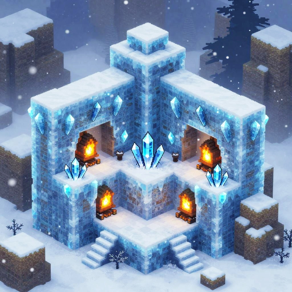 This digital CGI image depicts a snow-covered, three-dimensional crystal temple with a blue, ice-like texture. The temple has a symmetrical, geometric design with large, glowing orange flames burning in four arched windows. Sparkling blue crystals protrude from the structure, adding to its icy aesthetic. The background features a snow-laden landscape with large, blocky stone structures and falling snowflakes. The overall color palette includes shades of blue, white, and orange, creating a stark, wintry contrast. The image has a pixelated, blocky style reminiscent of classic video game graphics.