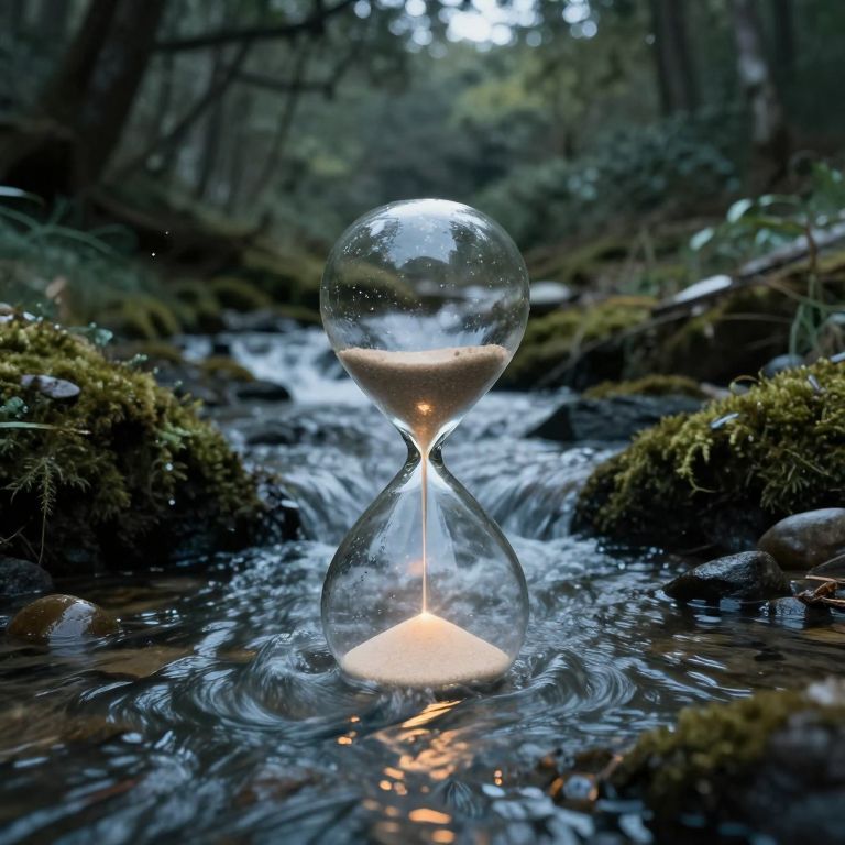 A river of liquid time flows uphill, its current carrying suspended moments and forgotten memories trapped in glowing hourglass bubbles.
