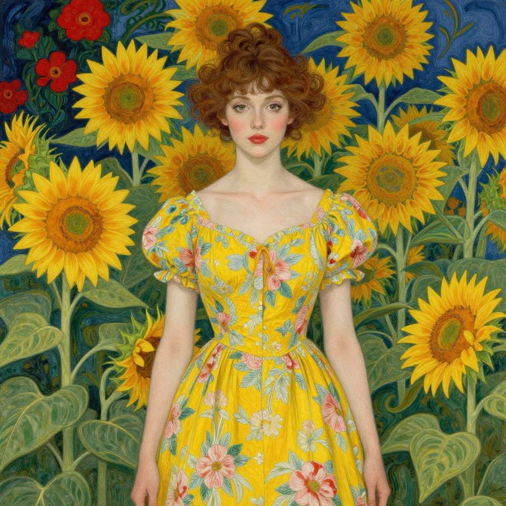 A vibrant digital illustration featuring a woman in a floral-patterned yellow dress, set against a lush backdrop of sunflowers and red blooms, evoking the intricate and fantastical style reminiscent of Richard Dadd's surrealist works.