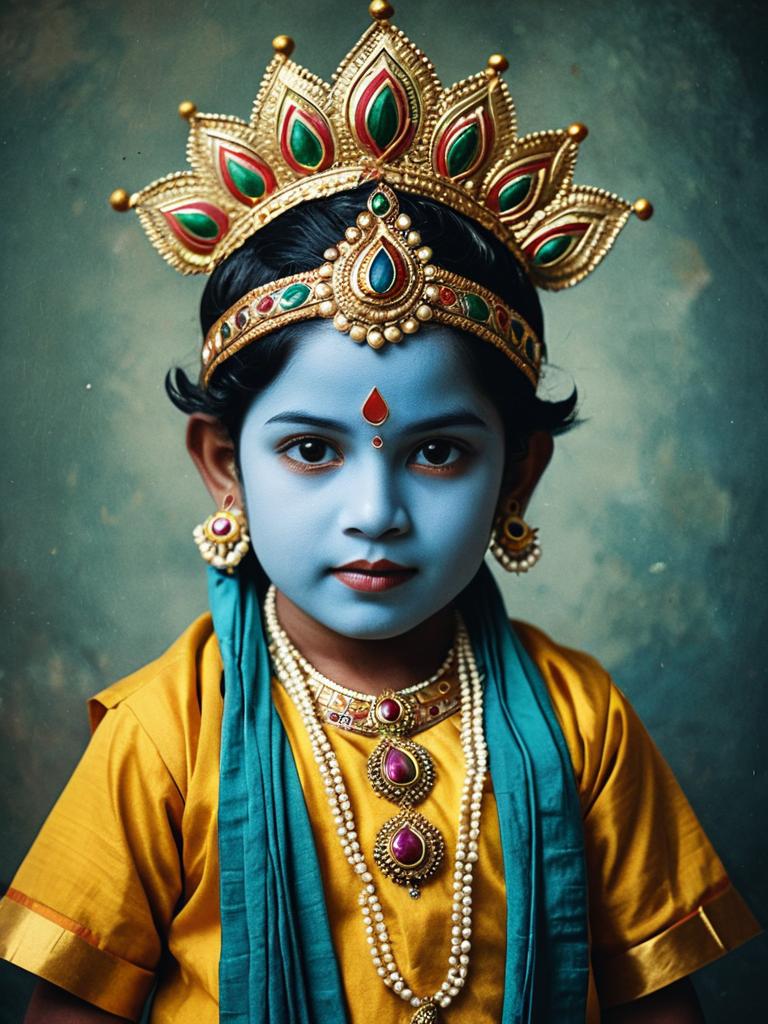 Child in Krishna Jayanthi Costume, photorealistic cultural cosplay portrait, cinematic realism