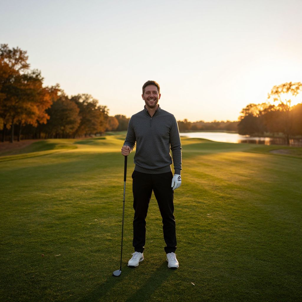 Serene golf course landscape at sunset, soft golden light illuminates the scene, a beaming birthday celebrant stands proudly holding a golf club, radiant smile spreading across his face, lush green grass beneath his feet, serene lake in the distance, warm autumnal hues surrounding him, capturing joyous moment. Man has masculine face and piercing eyes