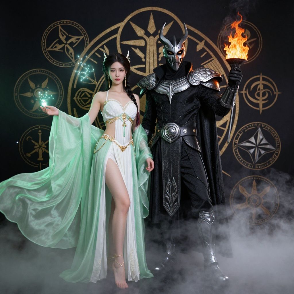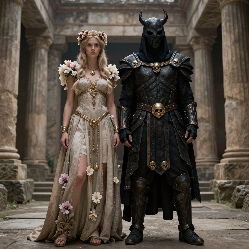 Hades and Persephone costume, stylized mythological couple wearing regal and dark themed attire, Persephone with blossoms and soft earth tones, Hades in shadowy armor with skull motifs, set amidst an ancient ruined temple, moody lighting, cinematic realism.