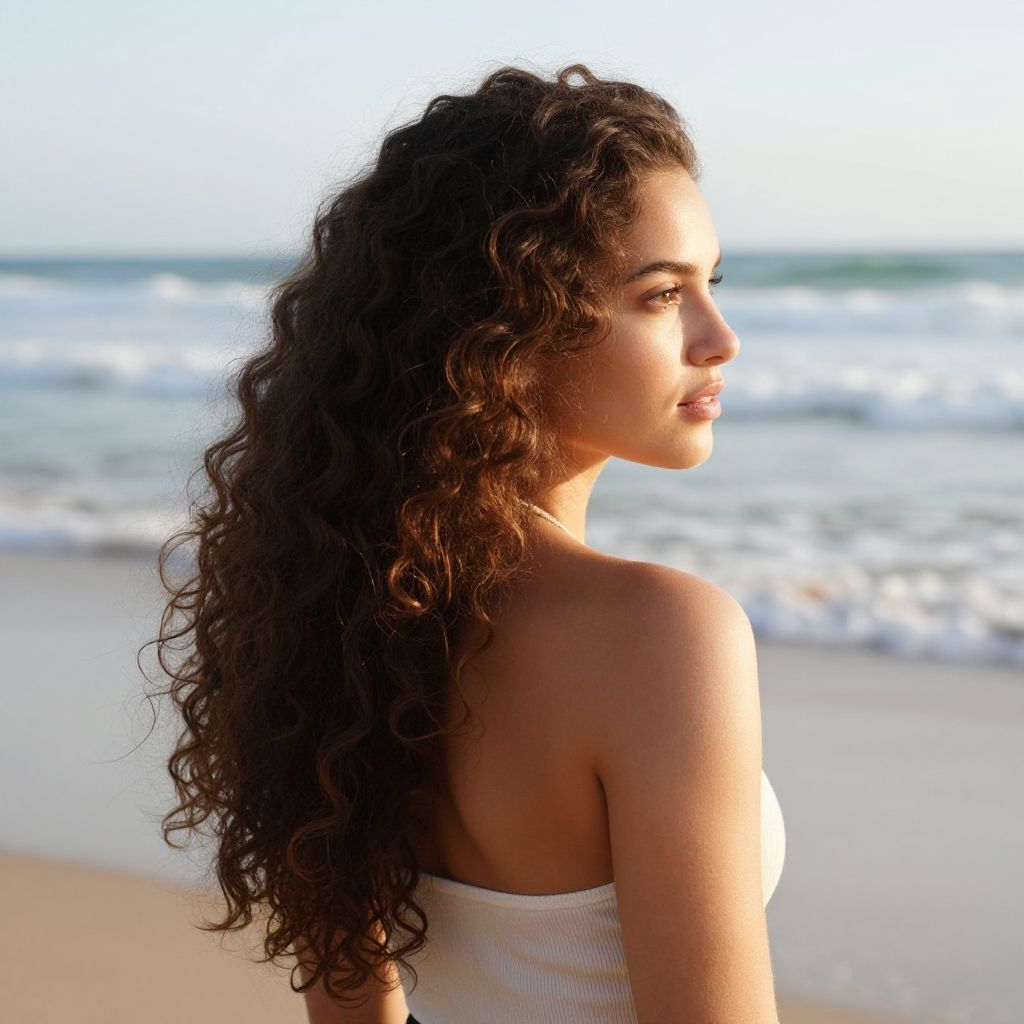 A serene beach scene featuring a woman with long, flowing curly hair, captured in a moment of tranquility as she gazes towards the ocean waves. The sun illuminates her soft, delicate features, highlighting the natural beauty of the surroundings. This image embodies a perfect blend of nature and fashion, making it ideal for lifestyle and beauty themes.