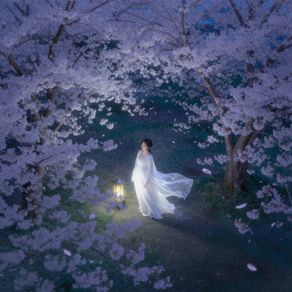 This digital artwork depicts a serene, nighttime scene under a canopy of glowing, purple-hued cherry blossoms. A woman with an elegant, ethereal presence stands at the center, dressed in a flowing white gown that billows gently in the breeze. She has dark hair styled in a simple updo. A soft, yellow lantern emits a warm light, positioned to her left. The background is a deep, midnight blue, contrasting with the bright white of her dress and the luminous flowers. Cherry blossom petals float around her, adding to the dreamlike atmosphere. The composition emphasizes tranquility and beauty, with a subtle magical realism style.