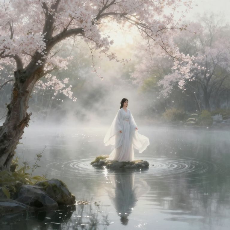Imagine an impressionistic masterpiece set in a tranquil nocturnal garden where delicate cherry blossoms flutter gracefully under the gentle caress of the evening wind. A solitary woman, draped in a heavenly white gown, stands amidst this floral waltz, her silhouette illuminated by the soft radiance of a nearby lantern. The scene is captured from a bird's eye view, highlighting the rich textures and dreamy ambiance of the garden. Brushstrokes of lavender, cerulean, and silvery teal merge harmoniously to evoke a sense of serenity and awe, while the woman's enigmatic expression beckons the viewer into this captivating realm of light and shadow.