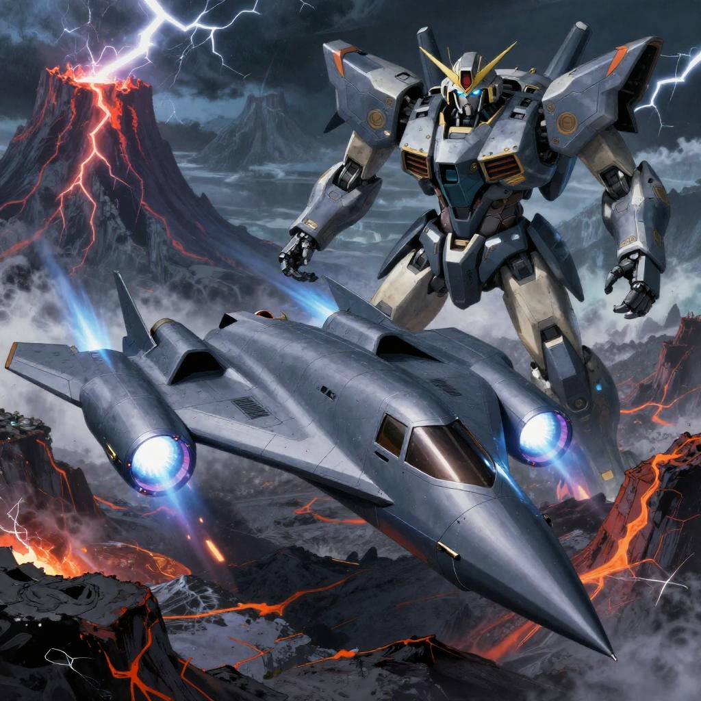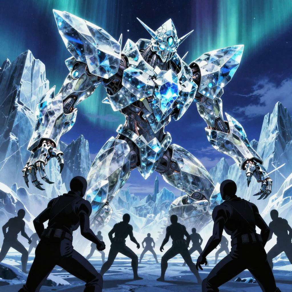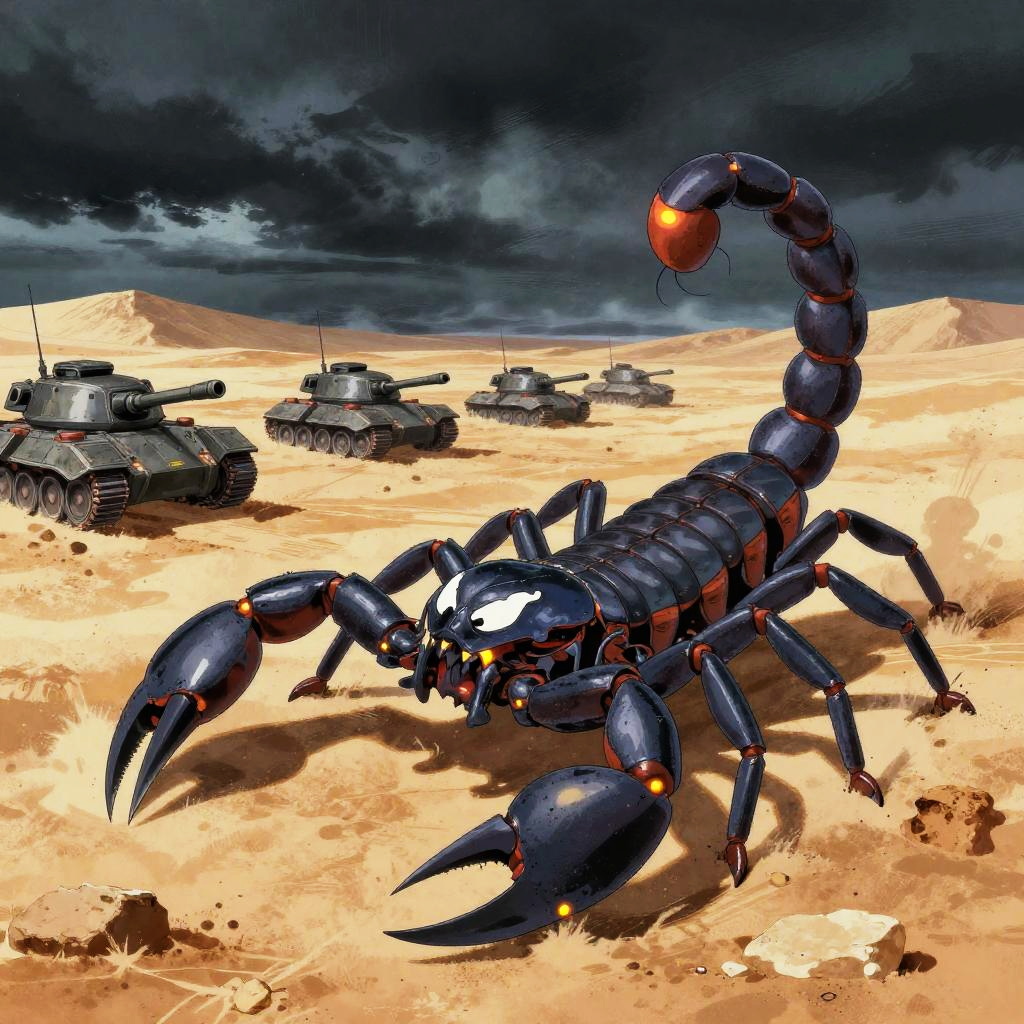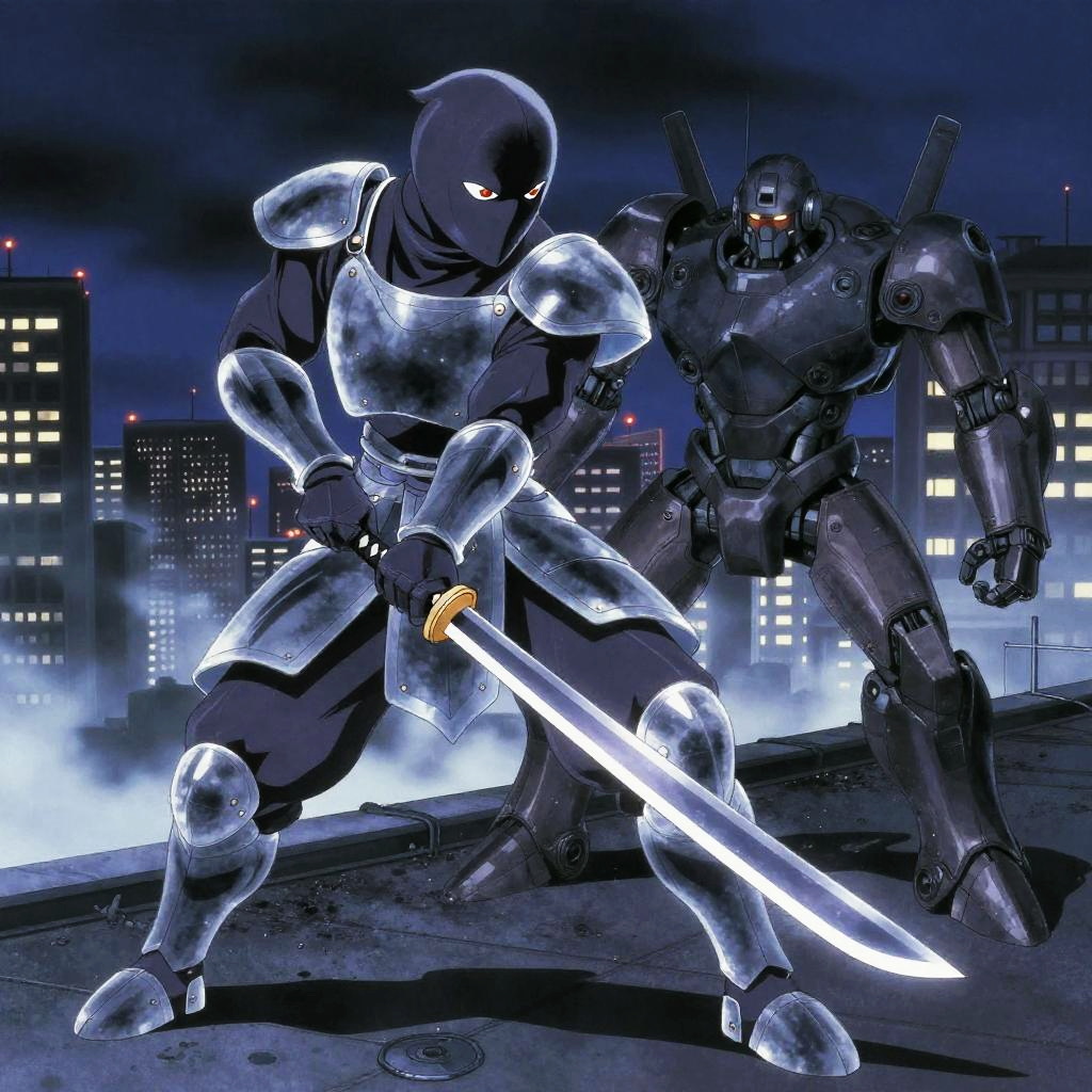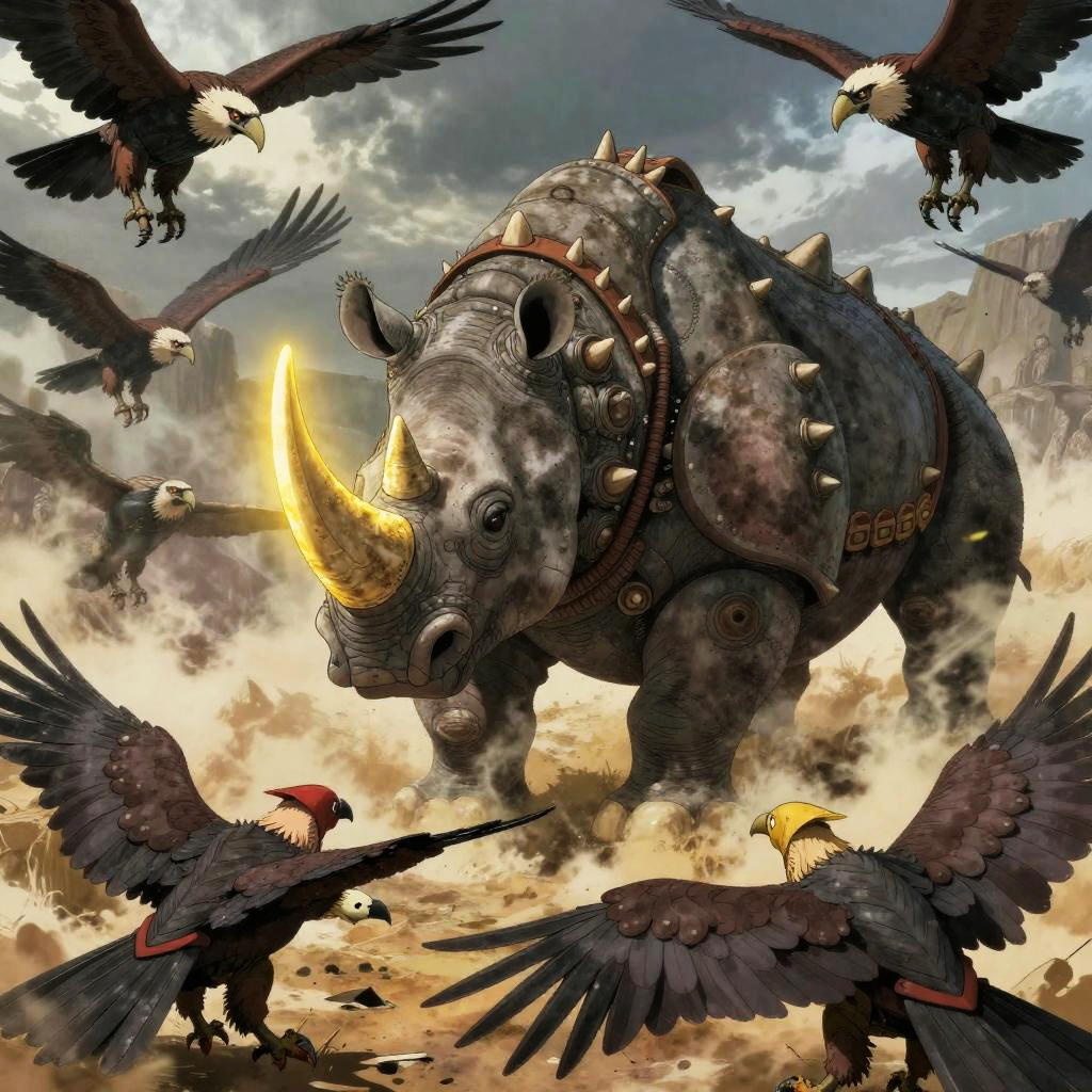 A cybernetic hawk, with metallic feathers and laser-tipped talons, fighting an armored ground mech, set in a neon-lit futuristic skyline at dusk, illustrated in the intense and cerebral style of Hideaki Anno.