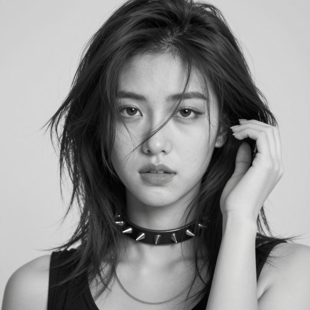 Close-up of a woman with short black hair, wearing a black top, with a mole on her right cheek. Her mouth is slightly open, showing glistening lips. She wears small hoop earrings. Background has colorful green and red lights. Dark shadows over her eyes. She has a visible wire earbud in her right ear.