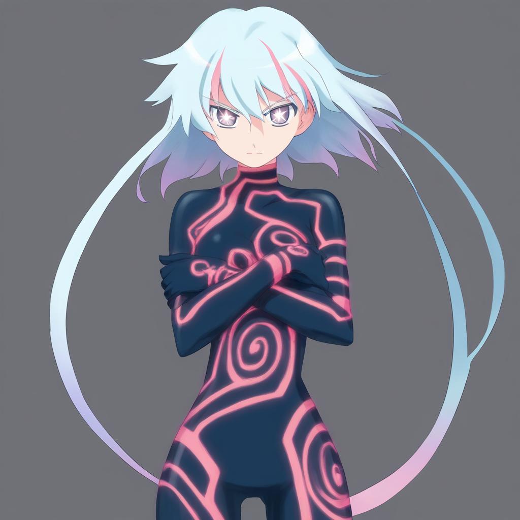 Digital illustration of an anime-style female character with very long multicolored hair and glowing cross-shaped pupils. She wears a dark futuristic bodysuit adorned with bright pink glowing swirl and line patterns. The background is solid gray, emphasizing the character's striking appearance and intense expression.