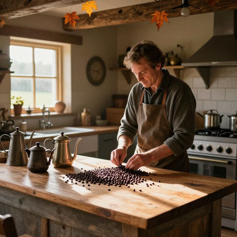 Photograph of a middle-aged man with curly brown hair, wearing a dark green long-sleeve shirt and brown apron, standing at a rustic wooden kitchen island. He is sorting black beans spread on the island's surface. The island has three silver kitchen pitchers. The background features a sunlit window, white tiled backsplash, and a stainless steel stove. Autumn leaves hang from a wooden beam above. The kitchen has a warm, rustic, homely feel with natural light enhancing the scene.