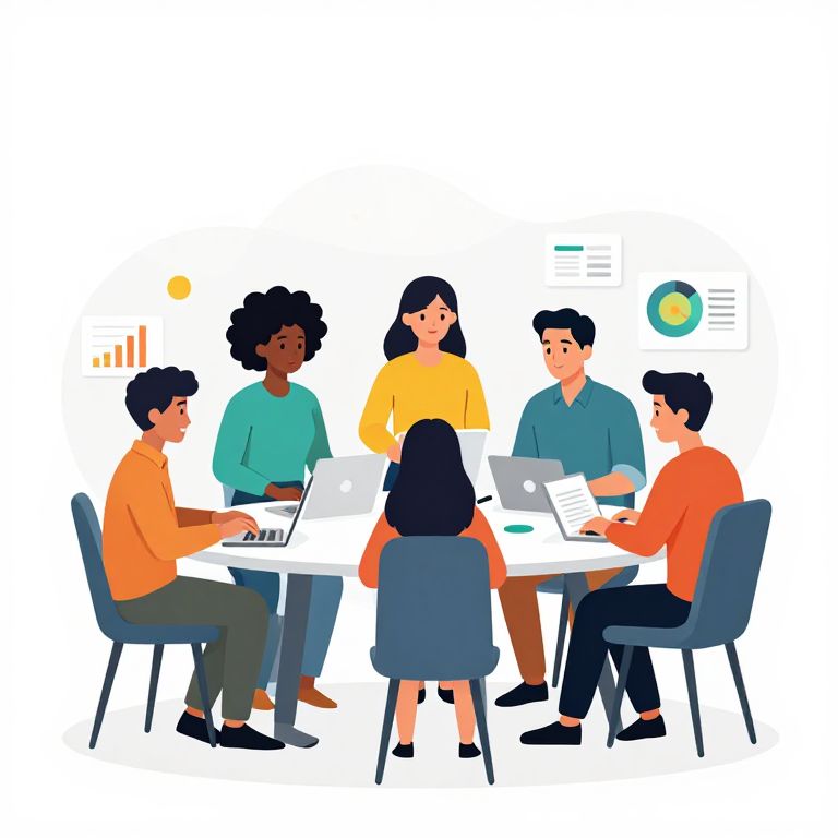Illustration of six diverse colleagues, three men and three women, seated around a table discussing, with laptops and papers, in a bright, minimalist style