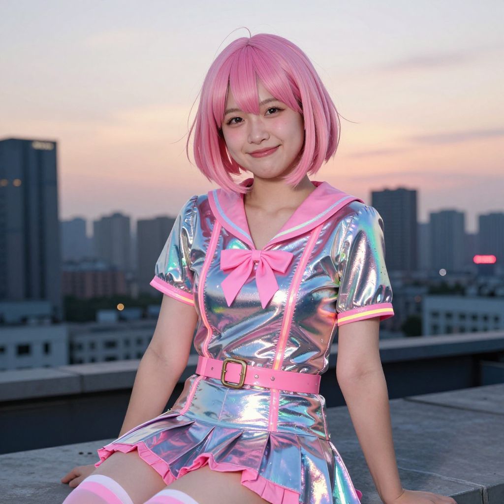 A cheerful teenager with a vibrant pink bob cut hairstyle and a shiny metallic costume featuring pink rainbores and neon accents sits on a rooftop in a city skyline at sunset, her face has a round chin, slightly upturned nose, and a playful expression, the city lights reflect off her costume in the background