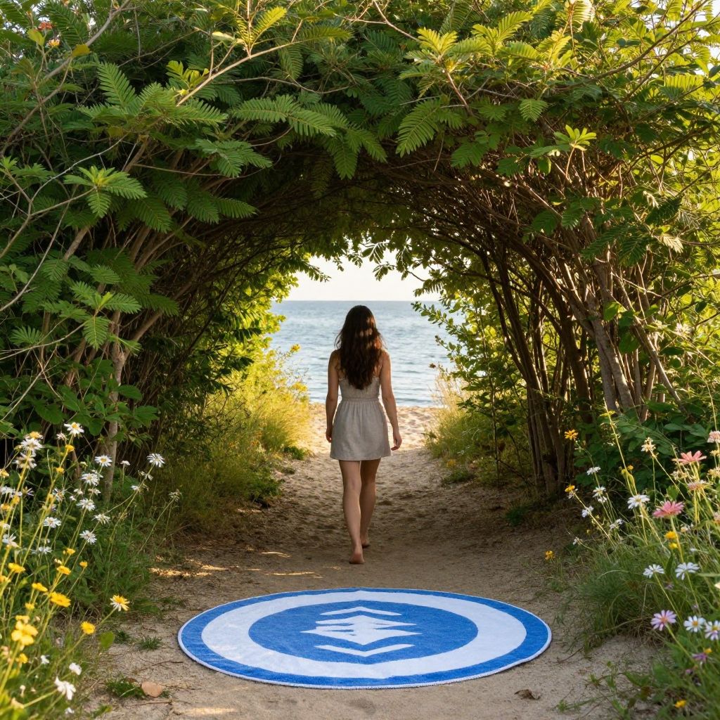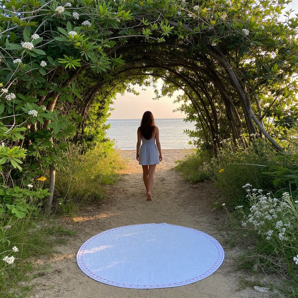 Circular beach towel showcasing a serene scene of a woman walking barefoot along a sandy path through a lush tree tunnel, framed by vibrant green foliage and wildflowers, leading towards a tranquil body of water under a soft, golden light.