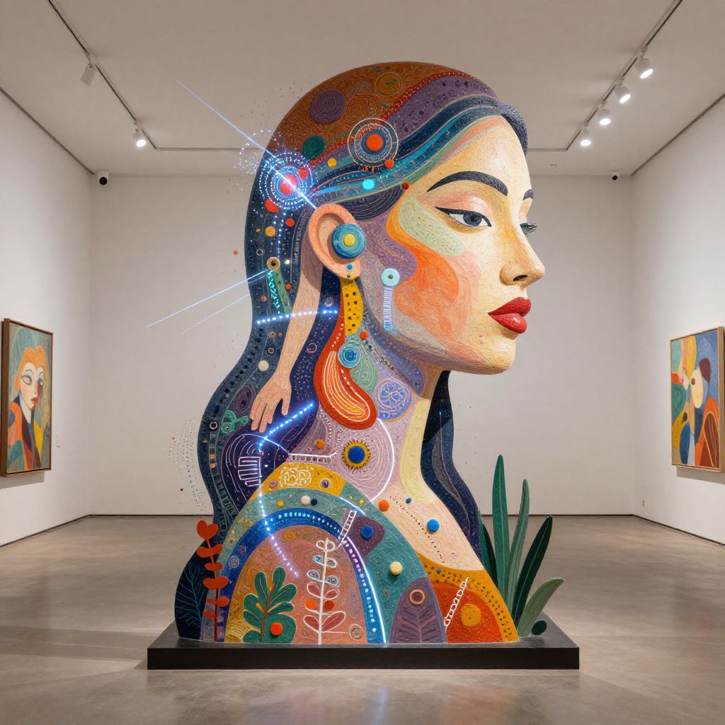 Ideal woman generator illustrated as a creative art installation, vibrant mixed media sculpture merging organic and technological elements, feminine curves blending with digital particles and light beams, gallery space with spotlights, contemporary and expressive art vibe
