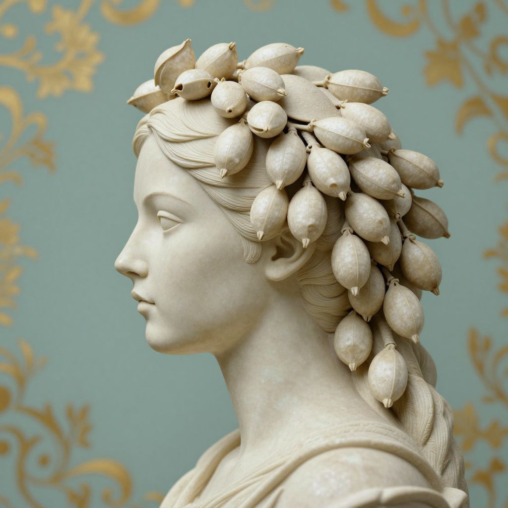 Ethereal sculpture depicts a serene profile of a woman adorned with a crown of intricately detailed, cream-colored seed pods that cascade around her head, set against a soft teal background with golden floral patterns.