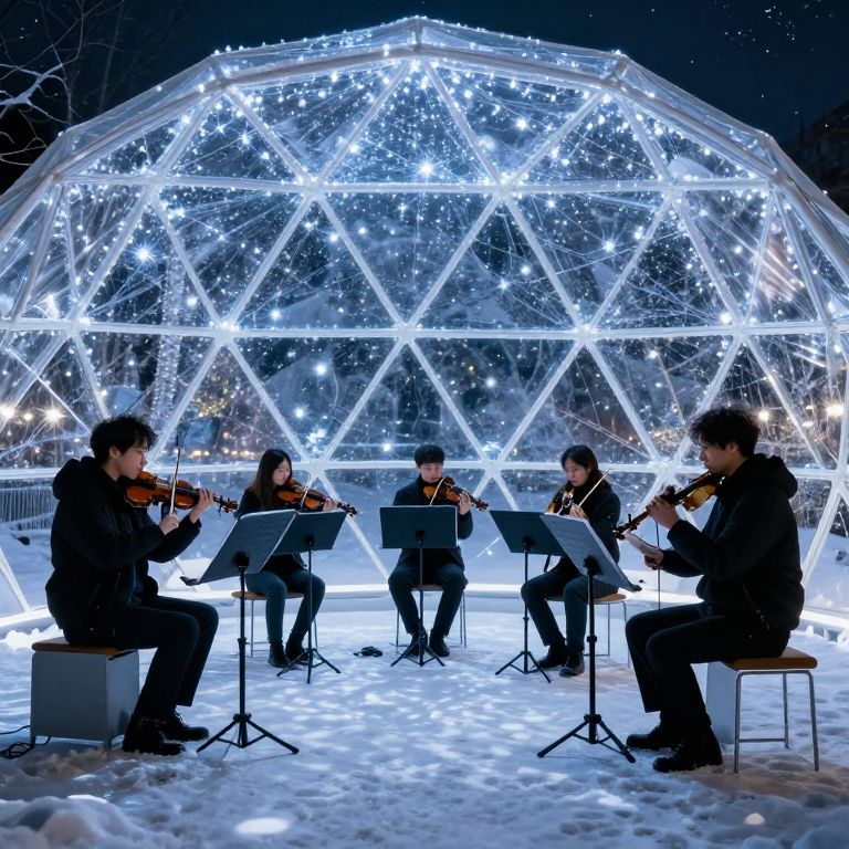A group of musicians perform under a luminous geodesic dome illuminated by a network of twinkling lights, creating a mesmerizing interplay of light and shadow against the snowy backdrop, evoking the ethereal beauty of frozen fireflies brought to life by their synchronized melodies.