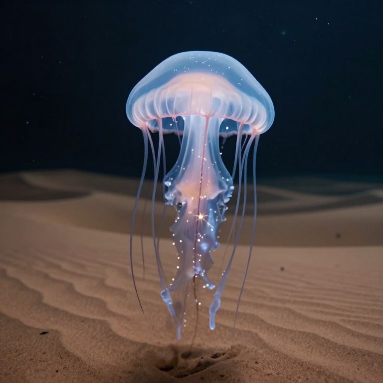 Photograph of a glowing jellyfish with a translucent, dome-shaped bell and long, delicate tentacles adorned with sparkling white bioluminescent spots. The jellyfish hovers above a sandy ocean floor, illuminated against a dark, starless night sky. The sand has subtle, rippled textures, and the jellyfish's ethereal blue and white lights contrast with the dark background, creating a mesmerizing, otherworldly effect. The image captures the delicate beauty and mysterious glow of marine life in a serene underwater setting.