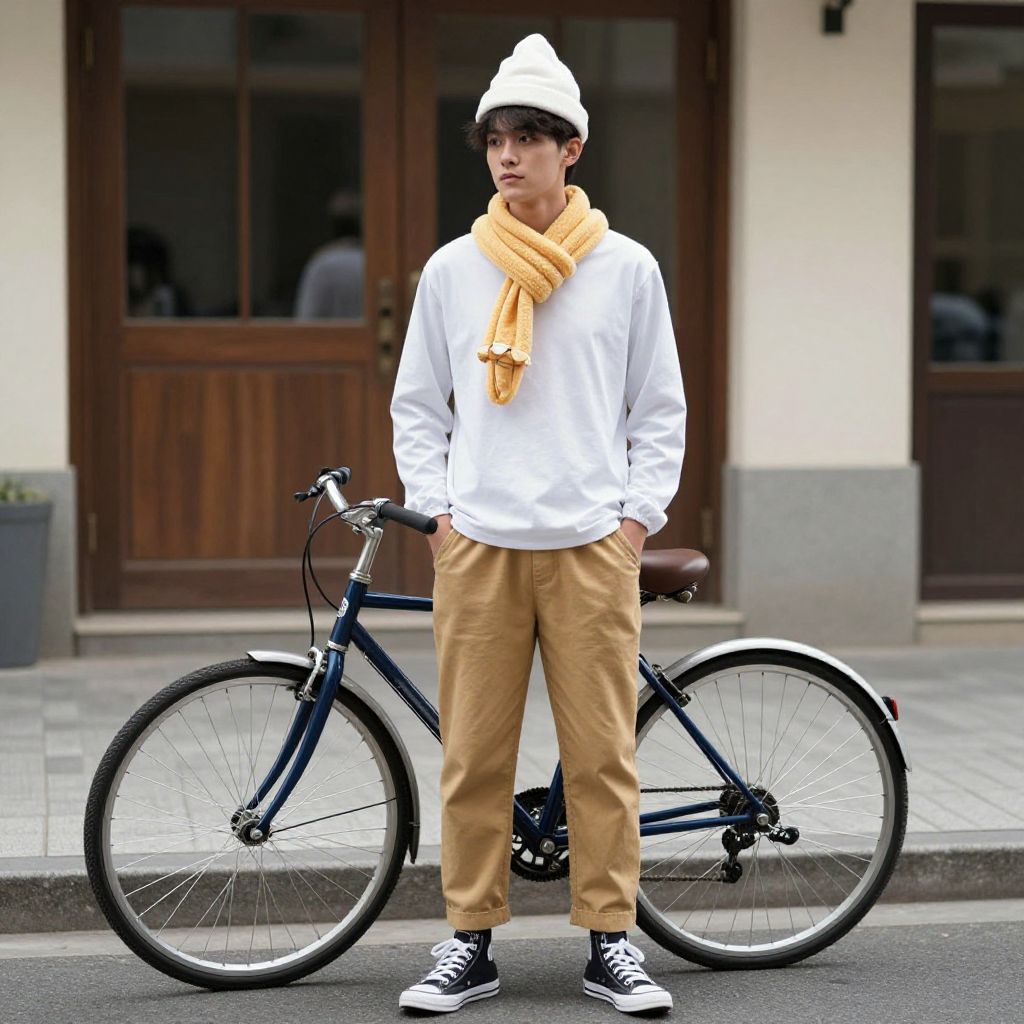 Photograph of an East Asian young man with fair skin and black hair, wearing a bright yellow bucket hat, yellow scarf, white shirt, yellow coat, and beige pants with a black belt. He stands confidently with hands in pockets, against a blurred urban background with indistinct people in dark clothing. The yellow coat and hat create a striking contrast with the white shirt. The overall style is modern and trendy, with a bold color palette. The background suggests a city street scene with trees and buildings.