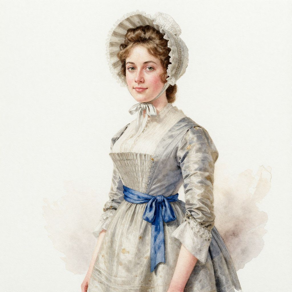 A delicate watercolour portrait of a Regency woman in a bonnet and high-waisted dress with blue sash