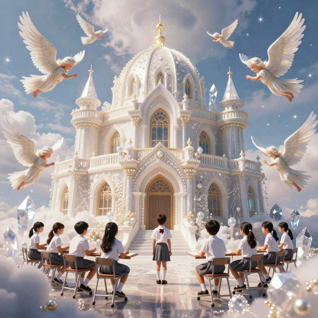 Schoolheaven, an otherworldly academy carved from crystal and pearl, surrounded by luminous heavens and radiant angels teaching young learners, soft divine light illuminating the scene