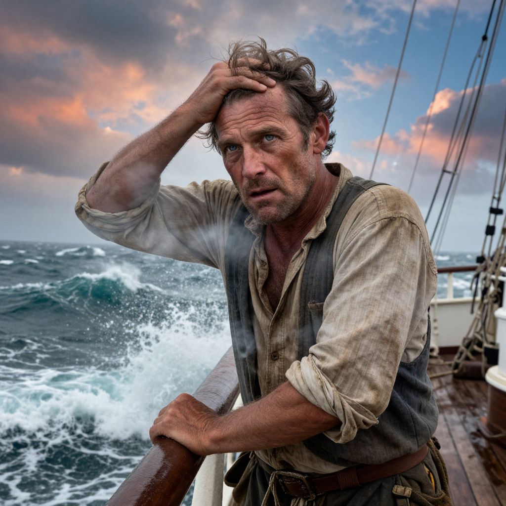 Photograph of a rugged, middle-aged man with disheveled brown hair and a scruffy beard, standing on a ship's deck during a turbulent ocean voyage at sunset. He has a weathered face, piercing blue eyes, and is wearing a dirty, button-down shirt with rolled-up sleeves and a gray vest. His right hand is raised, gripping his head, while his left hand rests on the ship's railing. The background features choppy waves, a colorful sky with pink and orange clouds, and ship rigging. The image has a high-contrast, dramatic style, enhancing the man's intense expression and the dynamic sea scene.