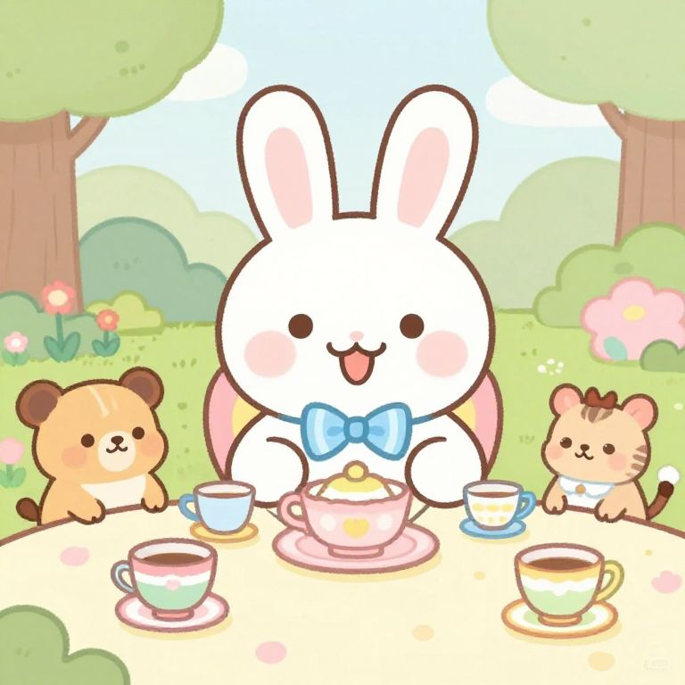 Cartoon character with bow tie, a smiling bunny with big ears and a striped bow tie, sitting at a whimsical tea party table decorated with pastel teacups, surrounded by animated forest critters, soft pastel palette, storybook art style