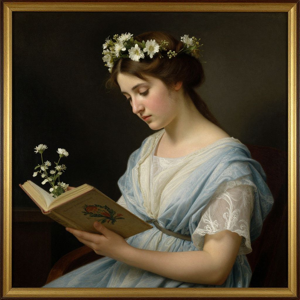 Classical painting of a young woman with brown hair, wearing a white dress and floral crown, reading a book with flowers. Dark background, golden frame