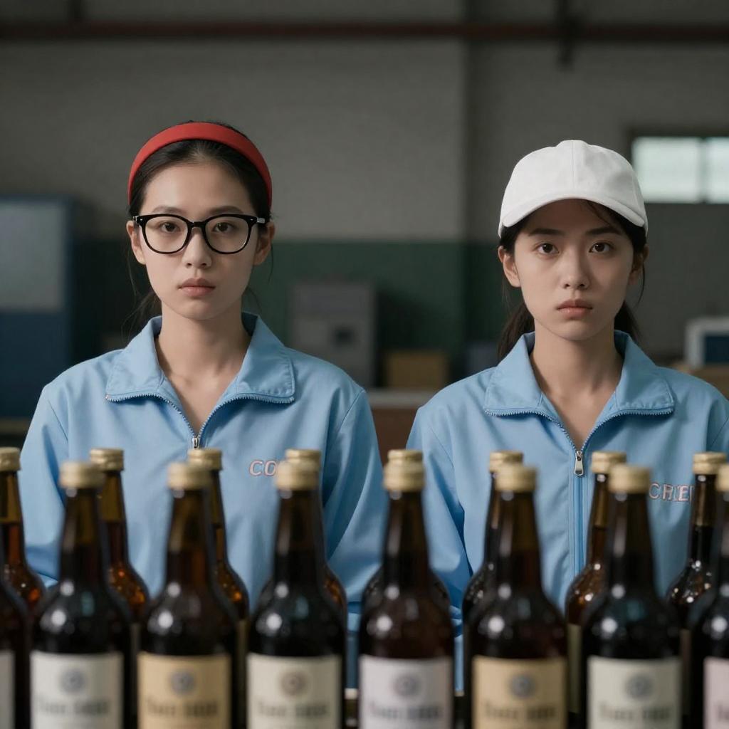 Two women in a dimly lit industrial setting. Both wear light blue jackets, one with black glasses and red headband, the other with a white hat. Rows of dark brown bottles in front. Both women have intense expressions, looking forward.