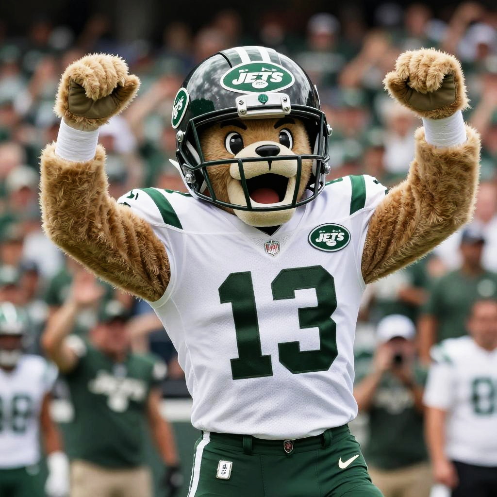 What is the Jets mascot portrayed as an anthropomorphic jet with muscular arms and a helmet, cheering wildly in front of a roaring crowd wearing team colors of green and white.