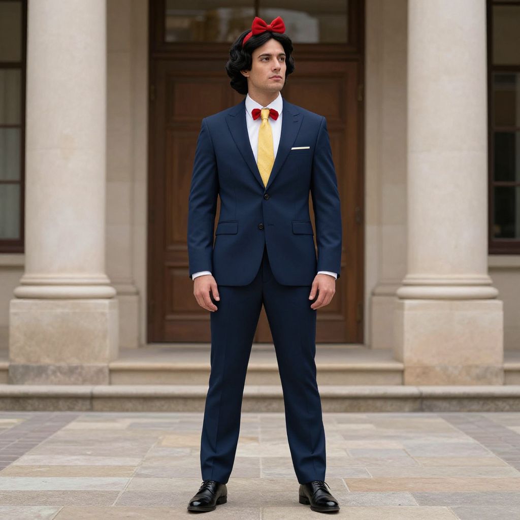 Photograph of a young man with medium brown skin and black, wavy hair standing in front of a classical stone building with tall columns and a wooden door. He wears a dark navy blue suit with a white shirt, yellow vest, and red bow tie, along with a red bow on his head. His black dress shoes are polished, and he stands with a neutral expression, hands at his sides. The stone pavement beneath him is multicolored. The image has a slightly surreal, fashion-forward style.