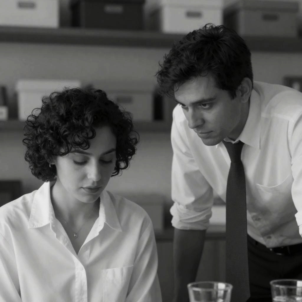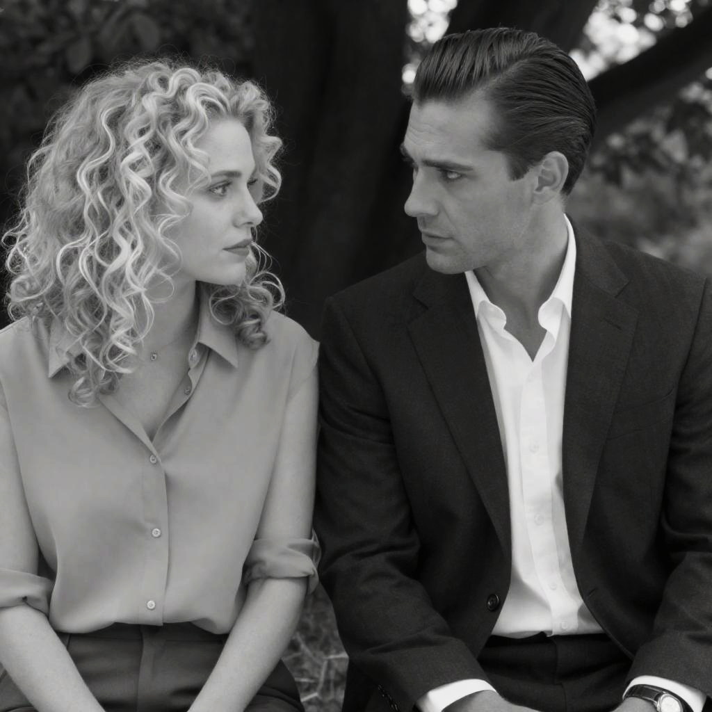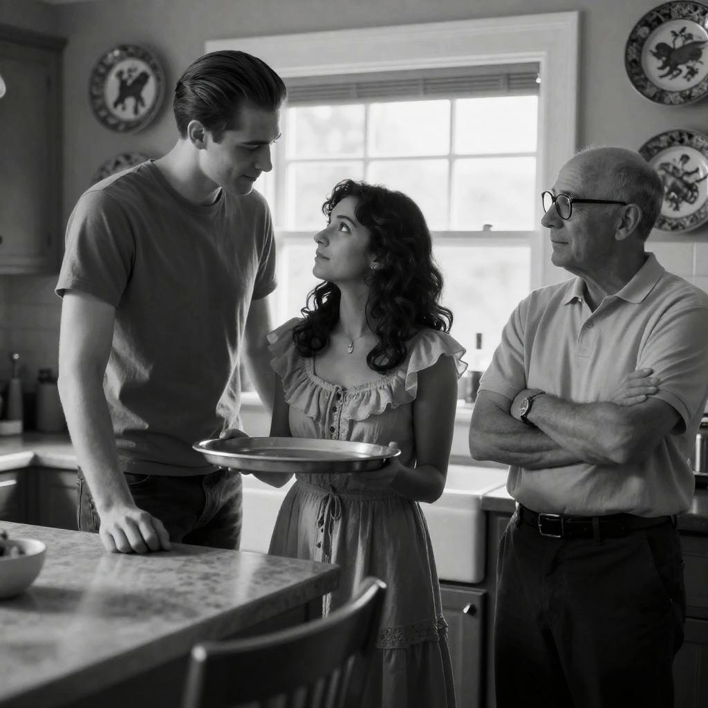 Black-and-white photograph of a man and woman in a rustic kitchen. Woman with wavy hair, wearing a sheer blouse and apron, holds a plate. Man with slicked-back hair, in a dark long-sleeve shirt, looks at her. Shelves with pots and pans in background. Woman has neutral expression, man has focused expression. Woman on left, man on right. Woman holds plate in right hand, man holds unknown object in right hand.