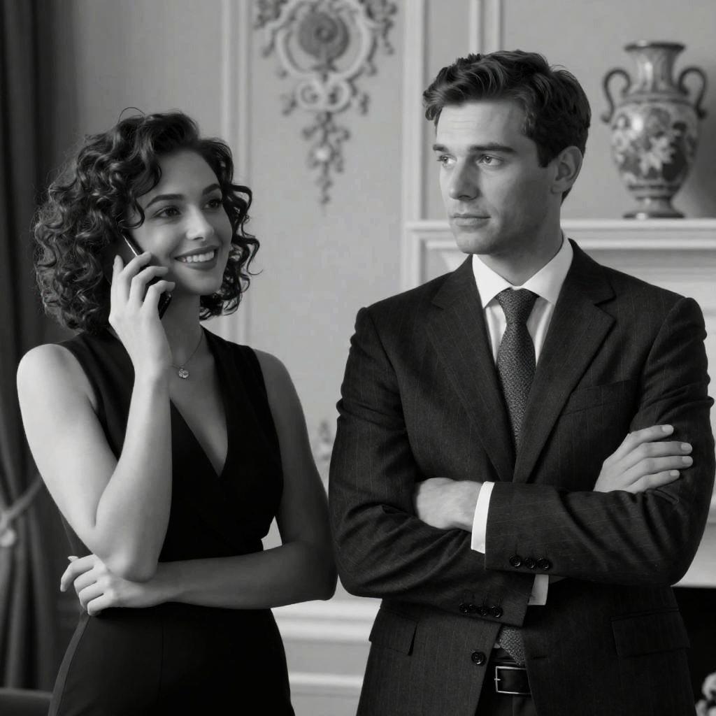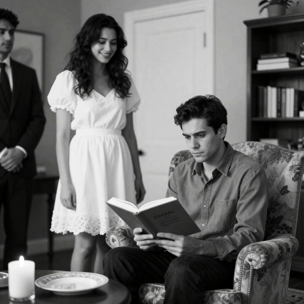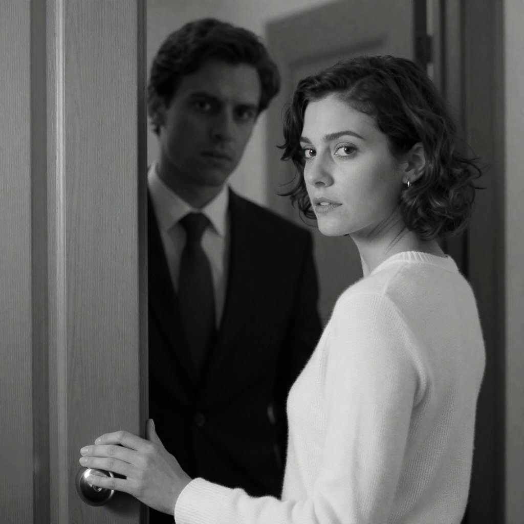 Black-and-white photograph of a man and woman in a rustic kitchen. Woman with wavy hair, wearing a sheer blouse and apron, holds a plate. Man with slicked-back hair, in a dark long-sleeve shirt, looks at her. Shelves with pots and pans in background. Woman has neutral expression, man has focused expression. Woman on left, man on right. Woman holds plate in right hand, man holds unknown object in right hand.